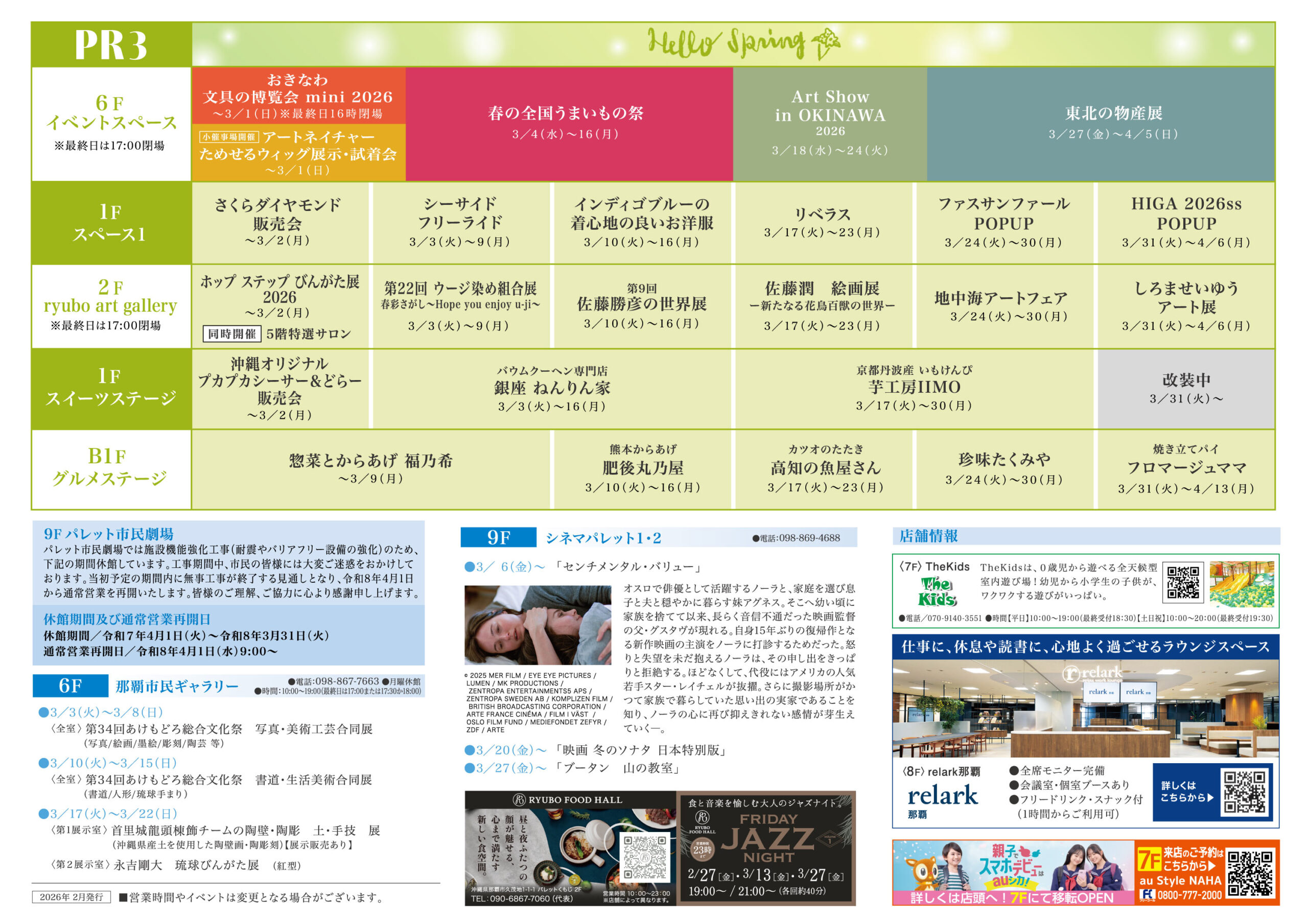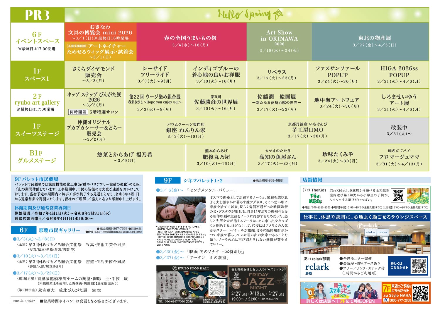2026年3月 催事情報更新のお知らせ イベント情報誌PR3の印刷物について3/17(火)〜23(月) 2F ryubo art gallery で開催のイベント情報に誤りがございました。下記の通り訂正させていただきます。【誤】佐藤閠 ー新たなる花鳥百獣の世界ー【正】佐藤潤 ー新たなる花鳥百獣の世界ー関係者ならびにご覧いただいたお客様にはご迷惑をおかけしましたことを深くお詫び申し上げます。 拡大版はこちら 拡大版はこちら ニュース 2026/04/02 「全国すし展」および「和菓子展」開催中止のお知らせとお詫び ニュース 2026/04/02 2F 琉貿果実苑フルーツパーラー 時間短縮営業のお知らせ ニュース 2026/03/19 2026年4月 催事情報更新のお知らせ ニュース 2026/03/02 2F 琉貿果実苑フルーツパーラー 時間短縮営業のお知らせ ニュース 2026/02/18 2026年3月 催事情報更新のお知らせ ニュース 2026/02/04 リウボウカードセゾンカウンター業務終了のご案内 ニュース 2026/01/16 2026年2月 催事情報更新のお知らせ ニュース 2025/12/22 2026年1月 催事情報更新のお知らせ ニュース 2025/11/28 2F 琉貿果実苑フルーツパーラー 時間短縮営業のお知らせ ニュース 2025/11/28 琉貿果実苑 フルーツパーラー2025年12月の営業時間のお知らせ