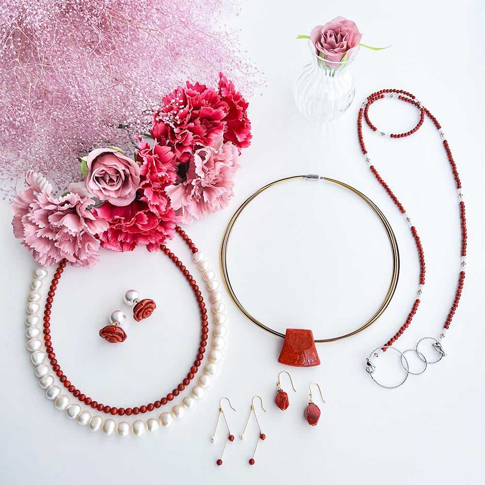 ピンクのサンゴとパールを組み合わせたアクセサリー。