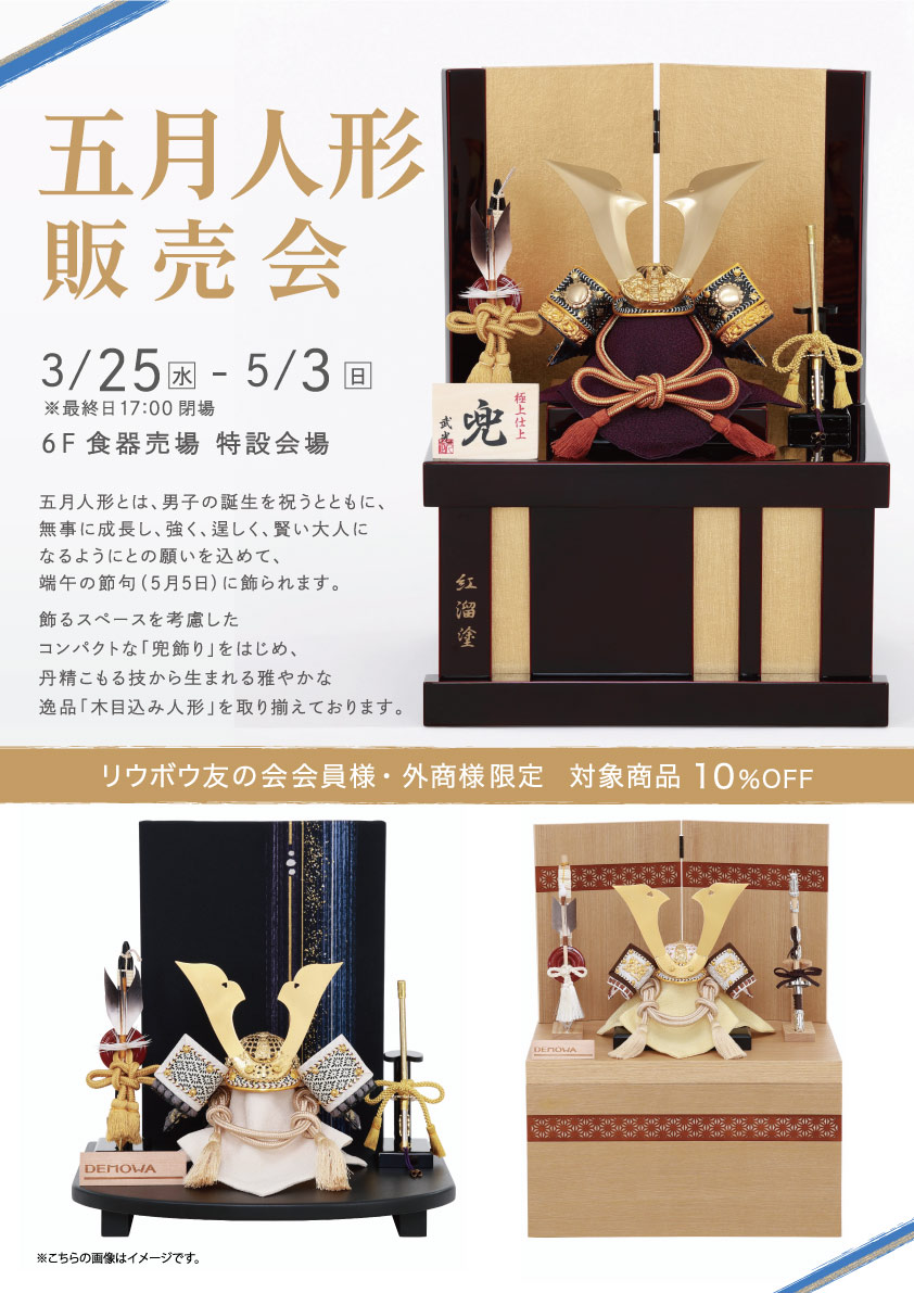 五月人形とは、男子の誕生を祝うとともに、 無事に成長し、強く、逞しく、 賢い大人になるようにとの願いを込めて、 端午の節句(5月5日)に飾られます。 飾るスペースを考慮した コンパクトな「兜飾り」をはじめ、 丹精こもる技から生まれる雅やかな逸品 「木目込み人形」を取り揃えております。 ※画像はイメージです。 リウボウ友の会会員様・外商様限定 対象商品10%OFF