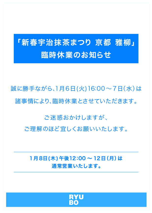 スイーツステージ(新春宇治抹茶まつり)1/6(火)16時~1/7(水)臨時休業のお知らせ
