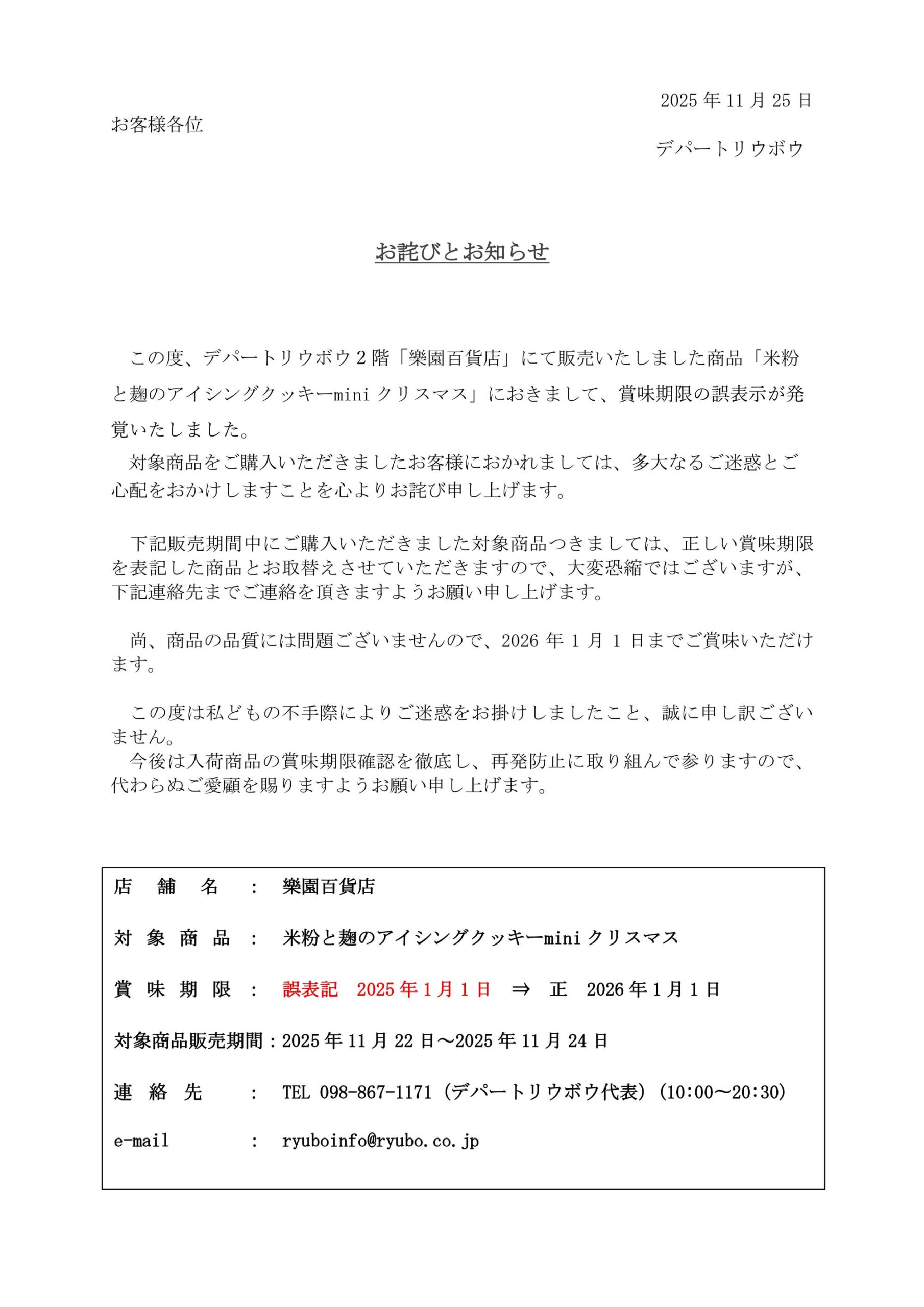 - ニュース 2025/11/25 樂園百貨店販売商品に関するお詫びとお知らせ